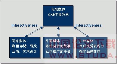 综上所述,视觉传播是电视媒体的主要特性,要取得很好的立体传播效果需要与其它媒体进行整合,其中媒体良好的设计表现以及互动传播是构成电视媒体立体传播效果最为主要的因素之一,另外平面媒体与户外媒体良好的视觉表现力也是构成电视媒体立体传播效果必不可少的因素之一。