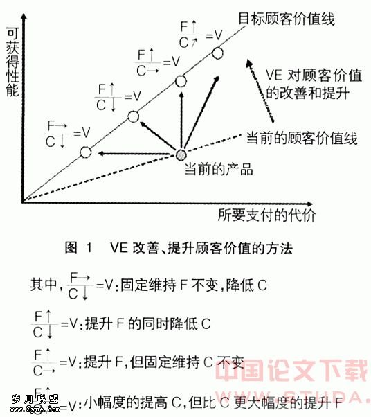 成本企画的主题内容是在目标成本规定的范围内,将顾客所期待的对产品性能的要求注入到新产品中而进行的各种降低成本的活动。为了实现这一主题内容,最重要的是创造并提出各种降低、改善成本的方法。价值工程(Value Engineering,以下简称VE)是对降低和改善成本活动的有力支持手段。VE是以顾客的所思所想为根本出发点,为了尽可能客观地、定量地向顾客提供最大限度的有利价值,即顾客价值,把站在顾客的立场上分析得出的产品必要性能和企业所能接受的目标成本相结合,在新产品的策划设计阶段将满足于这两方面要求的活动注入到产品中,进行达成目标成本、提升企业利润的一种手段。其改善顾客价值、提升顾客价值的具体方法如图1所示。