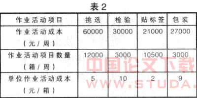 如表1、表2所列,某企业配送部门经作业界定、活动资源及资源动因确定,明确每种作业活动在一周中的总成本,再经统计一周内每种作业活动项目的数量,就可明确企业每一作业活动的单位成本,将作业活动成本分配到不同的产品或服务中即可进一步明确在每一次不同的服务中企业花费的成本,帮助企业进行决策分析。