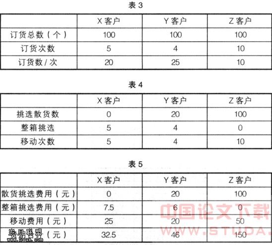 若中心内该货物的包装单位为20个/箱,则不同的订货需求产生不同的配货服务内容,如表4所列。按前述方法计算得:每个散货挑选的单位成本为1元;每箱商品挑选的单位成本为1.5元;移动的单位成本为5元。则企业在为三个客户服务时支付的成本如表5所列。