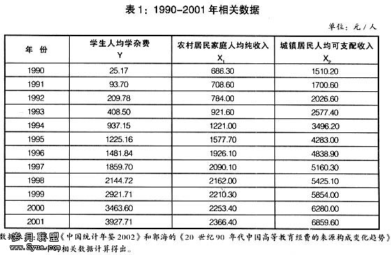 从以上实证结果可以看出, b1和b2这两个数字已经非常大了,它们说明相对于农村居民家庭人均纯收入(城镇居民人均可支配收入)的增长,学费的增长太快了,即在保持其他条件不变的情况下,教育成本中学生须分担的那一部分的增长速度将近是农村居民家庭人均纯收入增长速度的3倍,是城镇居民人均可支配收入增长速度的2倍多。
