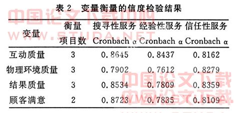 本研究采用衡量信度最佳的Cronbach’s α系数法。根据Nannally建议,Cronbach α系数只要大于0.7,问卷就具有很高的信度。[12]本次测评信度结果(见表2)表明本研究概念的测定尺度全部具有较高的内在一贯性评价。