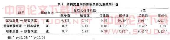 由表4可知:信任性服务样本数据中的“物理环境质量”对顾客满意影响系数估计值的t值为1.53(小于1.96的标准),说明该系数估计值在统计上不显著。除此之外,三类服务样本数据中其他8项系数估计值的t值均大于1.96,在统计上高度显著。由此可以得出结论:在“搜寻”和“经验”性服务中,服务质量三要素对顾客满意均有正相关影响;而在“信任”性服务中,“物理环境质量”对顾客满意影响?较小。