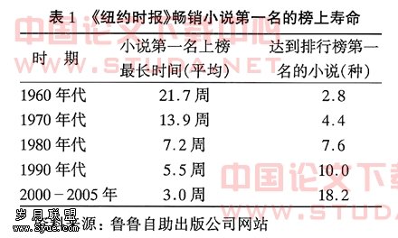 与此同时,畅销书的市场统治力正在减弱。Lulu.com是一家专营按需出版的公司,他们最 近研究了《纽约时报》畅销书排行榜50年的数据,结果发现,在过去10年里,小说类畅销书 第一名在排行榜上的寿命缩短了50%。这项研究显示,在1960年代,上榜畅销书的数量很少,但是一旦上榜,它们停留在畅销书榜 上 的时间多达几个月。在1990年代和2000年代,上榜的小说增多,但是每本小说只能在榜上停 留短短几个星期便被新的畅销书取代。鲁鲁自助出版公司(Lulu.com)的总裁鲍伯•扬(BobYoung)认为, 畅销书榜上寿命缩短反映了一个广泛的社会文化变迁,就像眼下影视和行业正在经历的 变化一样。例如,在1950年代,热门电视剧《我爱露茜》(I Love Lucy)能够吸引70%的美 国家庭。如今,最热门的电视剧《犯罪现场》(CSI)只能够吸引10%的美国家庭。鲍伯•扬 认为,图书出版的未来属于那些针对特定细分市场的“小众图书”,而不属于那些希图囊括 大众市场的“畅销书”。