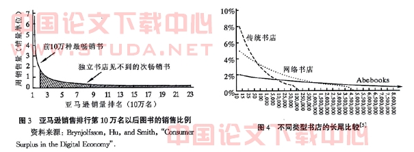 从图3的销售曲线我们可以看到亚马逊如何突破了困扰传统书店的陈列面积和最低读 者数量这两个限制。典型的巴诺超级书店通常陈列10万品种,我们就以10万为幂律曲线的头 部和尾部的分界线,销售量前10万种为头,销量排名低于10万的为尾。一项由麻省理工学院 、普度大学和卡内基•梅隆大学的学者合作的研究比较了亚马逊销售曲线的“头”和“尾” ,结果显示,亚马逊47.9%的图书销售来自销售排名第4万种以后的图书(美国最大的独立书 店的陈列品种是4万,这意味着亚马逊48% 的销售来自那些在独立书店见不到的图书);39. 2% 的销售来自销售排名第10万种以后的图书,即那些传统书店通常不进货的“长尾图书” 。换句话说,图3中那个阴影区域代表一个在传统的图书销售渠道里不存在的全新的市场。 [4]