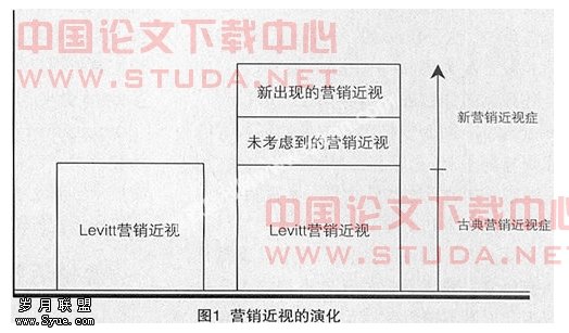 营销近视症作为一种客观存在,在哈佛大学商学院Levitt教授揭示它之前就在“模糊人们的视线”(Salai,2001),通常表现为在市场上“看不清消费者”、“看不清竞争对手”、“看不清内部员工”、“看不清国外市场”、看不清其它营销要素等。Levitt首先发现了营销近视症的潜在危害性,并于1960年在《哈佛商业评论》上发表了《市场营销的近视症》(Marketing Myopia)一文,呼吁人们规避营销近视。但是,受时代背景的制约,Levitt所揭示的营销近视症实际上只是停留在古典阶段,见图1。随着社会的变化,市场上的营销近视也处于不断演化之中,这其中包括古典营销近视症性质的改变和新营销近视症的出现。新营销近视症概括起来包括两大类:Levitt在当时的背景下未曾考虑到的营销近视症;新出现的营销近视症。其中新出现的营销近视症内容比较宽泛,而且其演变也将随着社会的和市场的变化而不断进行。从这个角度看,营销近视的演化不会停止,不过营销近视症的性质将有所改变。从演化趋势看,营销近视将更多地从“内向导向型近视”(inward-oriented Myopia)转向“外向导向型近视”(outward-oriented Myopia);从忽视市场转向忽视员工和竞争者;从规避一种营销近视导致产生另一种形式的营销近视。