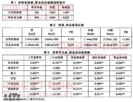 自我效能感和职业成功感两个因变量在性别上的差异检验结果表明:男性在自我效能感、职业成功感上均高于女性,但未达到显著水平(P>O.O5);两个因变量在岗位上的差异检验结果表明:外勤的自我效能感和职业成功感均高于内勤,但未达到显著水平(P>O.O5)(见表2)。