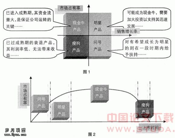 产品生命周期,是指一个产品的销售,要经历出生、成长、成熟、老化、死亡等阶段。著名的波士顿咨询集团提出了一种矩阵分析法(波士顿矩阵),它根据产品在市场的不同表现,以“市场占有率”和“销售增长率”为界把其分为四类,如具有高市场占有率和高销售增值率的为明星产品,……(图1),并针对性地提出了不同的营销策略。一般而言,对处于不同生命周期的产品,其市场表现皆可在波士顿矩阵中找到(图2),并可借助波士顿策略对其进行营销管理。