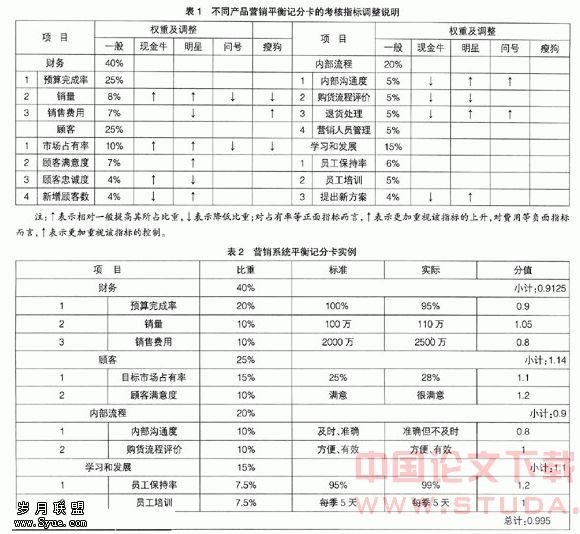 在这些指标中,有的是针对整个营销系统的,有的是针对产品的。就产品的指标而言,对不同的产品,营销平衡记分卡指标偏重是不同的,如对“现金牛”、“明星”而言,销量指标在整个体系占有较高权重;而对“问号”、“瘦狗”而言,并不要求提高该指标所占权重。因此,表1给出了上述各指标在一般情况的权重,并提出了针对不同类别产品调整指标的建议,供实务操作者根据自己的实际情况在使用时参考。