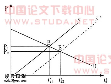 上式中作为生产某种产品的成本C如果增大,企业生产的积极性会受到影响,企业可能从主观上不愿意、从客观上不可能生产这种商品。所以,理智的生产者将减少此产品的供应。(见下图)从市场的均衡理论来分析,假设市场上的需求不变,而供给发生了变化,那么均衡价格是不是发生了变化呢?回答应该是肯定的,并且随着成本变化的程度增大,其影响增大。图中P代表价格;Q代表产量;S代表供给;D代表需求;B代表均衡点。