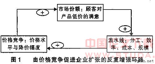 正如比尔•唐纳森所描绘的,工业革命是这样进行的:……以有系统、有规则、有次序地把科学和技术应用到商品生产和服务领域为特征,生产数量迅速提高,而价格相对持续降低……由于商品供货量增加,消费者满意了,制造商的销售和利润也提高了。事实上,在需求超过供给的市场条件下,通过产品低价满足持续增长的消费者需求,配以流水线大规模生产使成本持续下降,形成企业不断扩张的循环模式(如图1所示), 这就是福特所奠定的现代企业发展的一个范式。对此,泰德•李维特(Ted Levitt)在《营销近视》(Marketing Myopia)一文中对福特的天赋给予了全新解释:“人们都赞誉他在产品生产上所显露的天赋,但其实夸错了地方。实际上福特的天才真正表现在营销方面……他的低价格策略促成了大批量生产,而不是相反。”