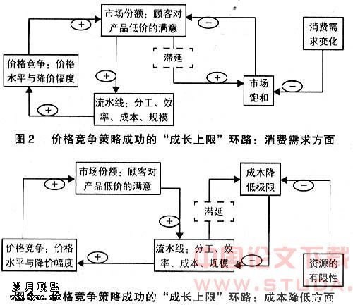 但福特固执于自己的政策,拒绝接受对T型车做任何修改,哪怕是细微的改动,比如他不相信T型车可以有别的颜色。可以说,由于福特不能把握顾客的消费取向,结果导致市场份额的大量流失。对此,泰德•李维特在《营销近视》一文中,从市场营销学的角度对福特进行了重新评价:“大规模生产受到他们所能生产的东西的巨大操纵力的驱使,由产出增长导致的单位成本急剧下降的前景是大多数公司通常难以抗拒的。获利的可能性看上去十分引人注目,所有的努力都集中在生产上,其结果是市场营销这一环节被忽视了。”如果运用彼得•圣吉“成长上限”模型进行考察(如图2),将能更清楚的了解消费需求变化对运用价格竞争策略实现持续成功的约束效应。