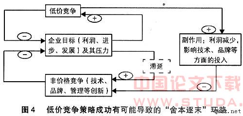 有限的降低成本是运用价格竞争策略实现持续成功的内在障碍。企业是以赢利为目的的组织,其价格不断降低的理性前提是产品成本的持续下降,但这取决于诸如技术的进步以及管理的创新等因素,并不能像产品降价那样随心所欲。即便能够不断通过技术进步和管理创新降低产品成本,但当其它企业纷纷运用类似福特模式谋求发展时,对资源的控制和争夺也势必抬升制造产品的原材料价格,从而影响产品成本的下降趋势。很明显,成本是另一个制约企业运用价格竞争策略取得持续成功的因素,同样可以运用彼得•圣吉“成长上限”模型(如图3)加以说明。