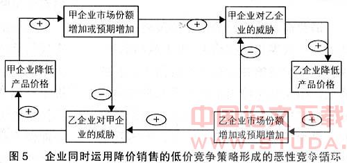 一旦企业陷入低价竞争陷阱,一系列可能的负面影响将是其必须面对的问题:首先是企业利润减少直接影响企业自我积累能力;其次是企业用于技术开发和创新的投入不够,对品牌管理与品牌培养心有余而力不足,不愿或不能开发使用先进的企业管理技术与手段;第三是下跌的产品价格加之以技术、品牌、服务等不足,会动摇消费者的消费信心和品牌信任感及忠诚度。企业最终将陷入价格战的恶性循环而不能自拔(如图5),由此对消费者、企业自身、行业以及经济和社会等各方面造成的危害必须引起各方关注。事实上,价格战一旦开始就难以停息,它将一些企业“淘汰出局”的情形是一个漫长的过程。整个行业产能并不会因此减少,它只会转移到其他企业而不常离开行业。