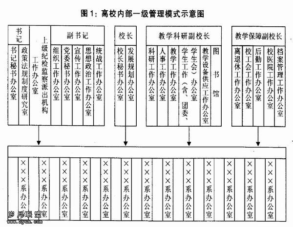 (二)高校校级领导及机关管理工作人员职责 设书记1人,全面负责学校的党的组织领导工作,保证党的方针路线、政策的贯彻实施,把握学校办学的政治方向;设副书记1人,主要协助书记负责党务方面的工作;设一个政策法规制度研究室,设工作干事负责研究执行党的方针、政策,制定学校的有关制度。 设校长1人,全面负责学校的行政工作,规划学校的学科建设、改革与;设主管教学、科研和人事的副校长1人,因人事工作与教学工作紧密相联,由主管教学和科研的副校长统—管理较为合理。教学、科研副校长,主要负责与教学密切的教学管理、学生管理、科研管理、人事管理、图书馆管理等项工作,分别设专项工作管理干事,直接对分管教学和科研的副校长负责,并与分管副校长随时保持信息畅通,以便及时研究解决问题。上述工作管理干事的职责分别是:①教学工作管理干事,主要负责学生的学籍教学行政工作等;②学生工作管理干事,主要负责招生、就业推荐、学生思想工作、团委、学生会等凡涉及学生方面的工作都归学生工作管理干事负责;③科研工作管理干事,主要负责全校的各单位科研项目的申报、评奖、项目经费管理等工作;④人事管理干事,主要负责教师职工调动、工资福利等人事工作;⑤图书馆管理工作干事,主要负责图书馆行政管理工作。设教学保障副校长1人,主要负责协助校长管理除了教学、科研和人事等项工作以外的教学保障管理工作,包括教学设备、保卫、档案、后勤、、工会、离退休等项工作管理,每项工作分别设管理干事。上述机关各项工作管理干事编制人数根据各校规模大小和工作量配备,干事的级别待遇可根据工作职责来确定。 为有利于学校的健康发展,保护教职工的合法权益,充分调动教职工的积极性,在逐步扩大高校自主办学权的同时,要加强对高校权力的监督,纪律监察工作人员应由上级机关下派,学校设纪律监察派出机构工作办公室,直接对上级组织负责,对学校工作实行监督。各院(系)设办公室主任1人,负责各院(系)教学、科研等工作及与学校保持工作信息联系;设秘书1人,负责与院(系)办公室主任和学校之间日常工作信息联系。各院(系)不设权力机构、不设级别,只设工作办公室,这样有利于学校统一领导。 三、高校实行一级管理体制新模式的对策 实行高校内部一级管理体制改革难度大、风险大,是涉及全局的大事。改革必将使我们长期形成的体制格局发生变革和重新组合,局部和整体之间的权力、利益分配将受到碰撞和冲击,但同时,行政权力相对集中于校一级,容易产生权力过分膨胀、滥用权力的现象,这就使高校管理干部的素质要求及其选聘方式显得尤为重要。因此,要改革干部任用制度,建立以才用人的科学机制,从而建设一支真正讲政治、讲正气、讲学习的具有化管理水平的高素质的高校干部队伍,尤其是要认真选好学校的“两个一把手”,即书记和校长。 现代高校管理制度要求,无论是高校内部管理系统本身,还是管理人员,其宗旨都是为高校的教学和科研提供高效和合格的服务。因此,党政机关管理者应首先具有较高的政治素养,具备马克思列宁主义、毛泽东思想、邓小平理论和“三个代表”重要思想的理论知识、政治学、社会学、系统工程论知识,人力资源管理与人才学知识以及行政法规及各项基本国策知识等,有强烈的事业心和工作责任感,真正树立执政为民的思想,坚持公平、公正的原则;其次,要精通高等管理专业知识,要具有很强的管理能力素质和较高的领导水平,具备良好的服务精神和群众观点。高校在改革用人机制方面应做到以下几点:首先,应切实建立一个公平、平等、竞争、择优的激励机制;其次,要解放思想,不断拓宽选拔优秀人才渠道,大胆启用优秀人才,切实对那些思想解放、讲究科学、实事求是、勇于开拓、积极进取的人予以重任并选拔到领导岗位上来,以发挥他们的作用;第三,实行科学的选人用人制度,坚持因事设岗,以岗聘人,打破身份界线,以才用人;第四,建立目标管理制度,明确岗位责任制,建立定期考核制度,打破干部终身制度。 高校内部实行一级管理体制是摆脱机构重叠、队伍臃肿,提高办事效率的根本出路,改革中来自各方面的困难在所难免,但是从长远考虑,实行一级管理体制是提高高校管理水平,全面提高高等教育质量,提高高校办学效益的有效途径。 [1]蔡克勇.高等教育管理改革研究五十年[J].高等教育研究,1999(03). [2]唐玉光,房剑森.高等教育改革论[M].南宁:广西师范大学出版杜,2002:215—246. [3]别敦荣.我国高等学校管理权力结构及其改革[J].辽宁高等教育研究,1998(05). [4]韩水法.试论我国大学微观管理制度的改革[J],深圳大学学报,1998(03). [5]谢维和.科学发展观与教育的改革[J],清华大学教育研究,2004(02). [6]吴秋风.用科学发展观指导高校的教学管理[J].理工高教研究,2005(06). [7]卢铁城.用科学发展观指导高教改革与管理[J].中国高教研究,2005(08).