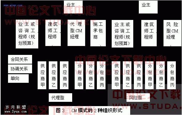 从国际上的应用实践看, CM的应用模式多种多样,业主委托工程项目管理公司(以下简称CM公司)承担的职责范围非常广泛也非常灵活,所以,对CM的应用模式进行完整的分类是困难的。我们根据合同规定的CM经理的工作范围和角色,可将CM模式可分为代理型建设管理(“Agency”CM)和风险型建设管理(“At_Risk”CM)两种方式:(1)代理型建设管理(“Agency”CM)方式。在此种方式下,CM经理是业主的咨询和代理。业主和CM经理的服务合同规定费用是固定酬金加管理费。业主在各施工阶段和承包商签订工程施工合同。业主选择代理型CM往往主要是因为其在进度计划和变更方面更具有灵活性。采用这种方式,CM经理可只是提供项目某一阶段的服务,也可以提供全过程服务。无论施工前还是施工后,CM经理与业主都是信用委托关系,业主与CM经理之间的服务合同是以固定费和比例费的方式计费。施工任务仍然大都通过投竞标来实现,由业主与承包商签订工程施工合同。CM经理为业主管理项目,但他与专业承包商之间没有没有任何合同关系。因此,对于代理型CM经理来说,风险最小,但是声誉损失的风险很高。(2)风险型建设管理(“At_Risk”CM)方式。采用这种形式,CM经理同时也担任施工总承包商的角色,一般业主要求CM经理提出保证最高成本限额(GMP:Guaranteed Maximum Price),以保证业主的投资控制,如最后结算超过GMP,则由CM公司赔偿:如低于GMP,则节约的投资归业主所有,但CM公司由于额外承担了保证施工成本风险,因而能够得到额外的收入。有了GMP,业主的风险减少了,而CM经理的风险则增加了。风险型CM中,各方的关系基本上介于传统的DBB模式与代理型CM模式之间,风险型CM经理的地位实际上相当于一个总承包商,他与各专业承包商之间有着直接的合同关系,并负责使工程以不高于GMP的成本竣工,这使得他所关心的问题与代理型CM经理有很大不同,尤其是随着工程成本越接近GMP上限,他的风险越大,他对利润问题的关注也就越强烈。