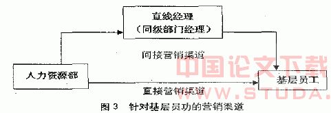 对于直线经理的营销,可以选择直接和间接两种渠道。一方面,人力资源部门可以以宣传、培训、会议等方式直接将“产品”传递直线经理;另一方面,各种人力资源管理的“产品”在得到高层管理者的认可和支持后,可以由高层管理者自上而下地通过布置工作、任务分解等方式传递给直线经理。