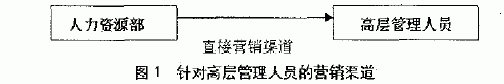 针对高层管理人员的营销,主要由人力资源部直接完成“产品”的传递。由于企业各项具体人力资源管理政策和各种人力资源计划的制定和实施,均须得到企业高层的认可,因而,作为具体政策制定者的人力资源部往往可以通过可行性分析报告、面对面沟通、会议等渠道将“产品”传递给高层管理人员。这也是针对该细分市场的最佳“分销渠道”。(如图1所示)