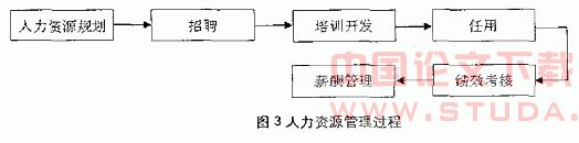1.人力资源管理含义。对人力资源管理的含义不同的国内外学者有不同的观点。有的学者从人力资源管理的过程或承担的职能出发,认为人力资源管理是一个活动过程,即人力资源管理是对社会或一个的各阶层、各类型的从业人员从招工、录取、培训、使用、升迁、调动直至退休的全过程管理。我们认为企业人力资源管理是人力资源管理部门从人力资源规划、招聘、培训开发到任用及绩效考核和薪酬管理的全过程管理。其管理过程如图3所示。
