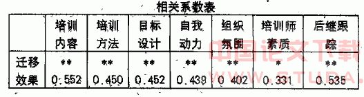 由问卷调查所获得的数据经过SPSS 10.0统计软件处理后,通过对数据的相关性分析,发现有8个因素与酒店业培训迁移效果显著相关。他们分别是培训内容、培训方法、培训目标设计、员工的自我动力、组织氛围、管理者的支持、培训师素质和培训的后继跟踪活动。数据的相关性分析结果如下表所示: