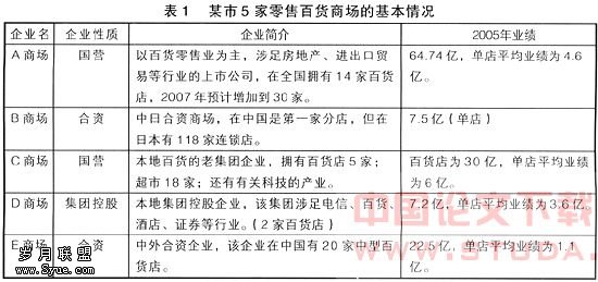 为比较分析百货零售企业一线员工管理模式,笔者对某市排名前5位的零售百货商场进行了调查,该5家商场的具体情况见表1。