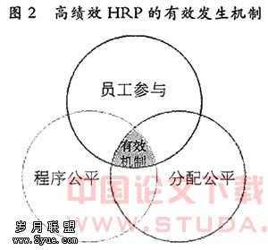 国内学者张一驰研究得出:高绩效人力资源管理实践的有效性发生机制可以理解为由于组织为员工提供一个参与决策和表达自己的机会,在组织的运行过程中保持一个程序公平的环境,同时在收入分配过程中按照员工的贡献公平地对员工进行补偿。即高绩效的人力资源管理实践发生机制应该具有员工参与、程序公平和分配公平这三个基本的元素(如图2)。这一结果与国外对高绩效人力资源管理的本质看法是一致的。正如MacDuffie的研究结果表明,高绩效工作系统、创新型人力资源管理模式以及变革型人力资源管理模式的本质都是员工工作生活质量、人际关系运动、霍桑效应、生产过程的社会与技术系统的相互平衡的作用(MacDuffie,1995)。