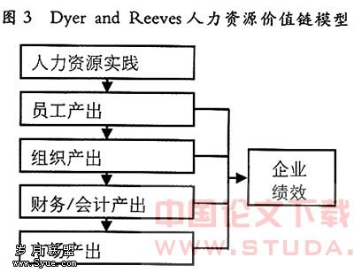 Dyer and Reeves在对组织绩效进行测量的方法研究中发现,组织绩效的四方面产出实际上代表了一种因果关系,即人力资源实践影响员工产出,员工产出继而影响组织产出,组织产出又影响财务产出,最终导致公司市场产出的变化。据此,他们提出了早期的人力资源价值链模型(如图3),通过该模型可以看出人力资源管理实践对企业绩效的传导机制。