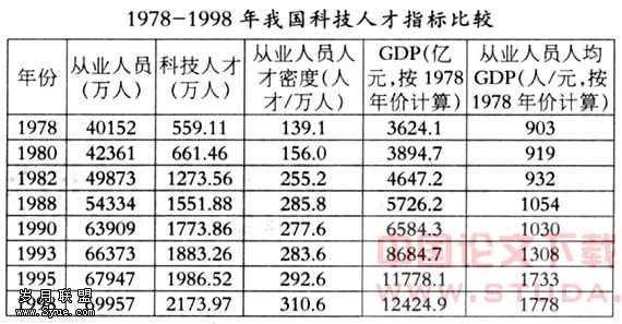 比较我国改革开放20年(从1978-1998年)科技人才资源增长与国民生产总值GDP增长的情况(见下表),我们可以得出这样几点结论: