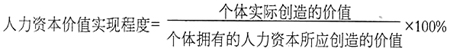 人力资本价值实现(本文特指价值)是指人力资本由静态价值转变为动态价值的过程,或称人力资本扩张的过程。社会、家庭和个人长期投资的结果形成了人力资本存量,即静态价值,而其动态价值,即人力资本的张力则是可能发挥的潜在价值,它需要在运营的过程中甚至是使用以后才能完全确定。人力资本的存量与张力是两个不同的概念,并非人力资本存量越高,就越能创造价值。人力资本价值实现程度可用公式表示如下: