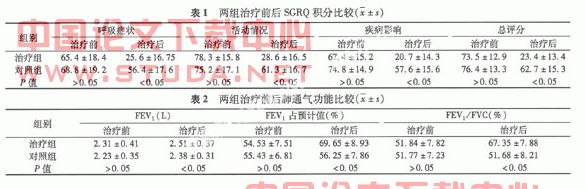 1.4 观察指标 所有患者在治疗前、后应用SGRQ测量生活质量,SGRQ有50项问题条目,分别测呼吸症状、活动情况以及疾病影响3个维度的内容。各维度预计分值的范围为0~100分,分数越低代表生活质量水平越高。肺功能检测均由Medi-soft肺功能仪(比利时麦迪公司)完成,在用药前后分别测定患者的第1秒用力肺活量(FEV1)及其占预计值的百分比(FEV1)、用力肺活量(FVC)和FEV1/FVC。?
