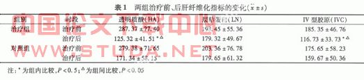 2.3 肝纤维化指标变化 2组HA在治疗后均比治疗前有明显的下降,但治疗组比对照下降明显,差异有统计学意义(P<0.05);治疗组的IVC治疗后比治疗前明显下降(P<0.05),对照组的IVC治疗前、后无显著性变化(P>0.05),治疗后2组IVC比较差异有统计学意义(P<0.05);2组LN治疗前、后均差异无统计学意义(P>0.05),见表1。?