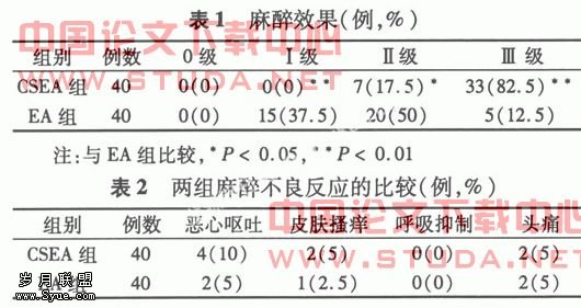 两组术中低血压发生情况: CSEA组有8例(占20%),EA组有7例(占17.5%)发生一次短暂低血压,均经迅速加快输液和一次静脉推注小剂量麻黄碱所纠正。两组术中低血压的发生率、输液量(765 ml和792 ml)和麻黄碱平均用量(8.72 mg和6.75 mg)差异均无显著意义。?