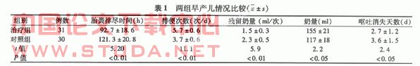 1.1 一般资料 我院新生儿病房2002年1月至2007年8月治疗的共61例早产儿,符合以下喂养不耐受标准:①频繁呕吐,每天>3次;②奶量不增加或减少持续>3 d;③胃残留量超过上次喂养的1/3或24 h胃残留量超过上次喂养的1/4;④腹胀。符合以上任一点[1]。所有患儿均排除胃肠道先天畸形,无其他并发症。其中男38例,女23例;体质量1000~1500 g30例;1500~2000 g 28例;>2000 g 3例;胎龄28~34周50例,34~36+6周11例。随机分成治疗组31例,对照组30例。均在性别、胎龄、出生体质量上差异无统计学意义(P>0.05)。