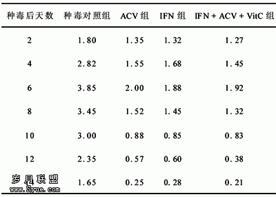 1.2.2 动物分组及治疗方法 24只兔感染成功后随机分为4组,每组各6只:(1)种毒对照组:不用任何药物治疗。(2)无环鸟苷组:给予无环鸟苷眼液治疗。方法:每2h滴眼1次,每次1滴,每天5次。(3)干扰素组:给予干扰素(滴宁眼液)点眼,方法同ACV组。(4)联合治疗组:给予干扰素(滴宁眼液)和无环鸟苷眼液交替点眼,给药方法同ACV组,2种眼药水点眼每次间隔10min。每周每只兔球结膜下注射VitC 30mg 1次(每眼每次15mg),共2次。