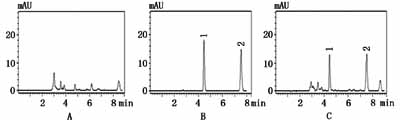 A.空白人血浆; B.标准品; C. 人空白血浆+标准品; 1. 氟康唑 2. 对羟基苯甲酸甲酯