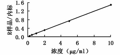 R样品/内标= 0.1498C-0.0093,r=0.9999,(P<0.01, n=5)(见图2),线性范围0.2~10.00μg/ml,最低检测浓度0.1μg/ml。