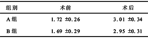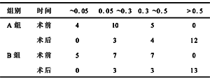 2.1 术后最佳矫正视力 A、B两组患者术后最佳矫正视力均有显著提高,脱盲率达到100%。视力改善情况,见表1,视力改善与是否手术显著相关,即手术都显著改善了视力(经χ2检验,χ2A=19.88,χ2B=21.20,P均<0.01);视力改善与采用何种术式无关(经χ2检验,χ2=0.1824,P>0.05)。