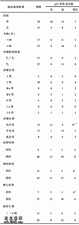表1 p27蛋白与临床病理参数的关系 (例)