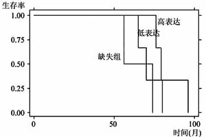 3.3 p27与预后 p27高、低表达及缺失表达组各组生存率经Logrank检验,在统计学上没有显著性差异,但在卡-迈二氏曲线上,p27的高表达组生存曲线明显高于低表达组与缺失组的生存曲线,且高表达组的平均生存时间84个月明显长于低表达组及缺失组的中位生存时间,后者分别为72个月与65个月。当增加样本量时可望得到各组生存率存在差异性的结论。这说明p27高表达组的预后要好于低表达组及缺失组。