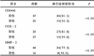表1 CD44v6、COX-2、MMP-2表达与淋巴结转移的关系 例(%)
