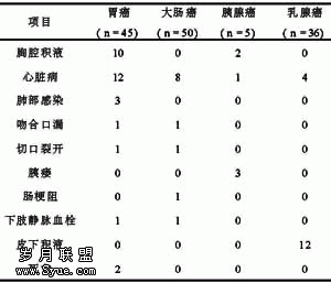 1.5 手术方式 45例胃癌中全胃切除14例,近端胃切除6例,远端胃切除25例;50例大肠癌中右半结肠切除5例,左半结肠切除11例,Dixon手术28例,Miles手术6例;36例乳腺癌均施行保留胸大肌的改良根治术;5例胰腺癌中胰头十二指肠切除术2例,胰体尾+脾切除3例。所有根治手术淋巴结清扫范围均到达第二站。