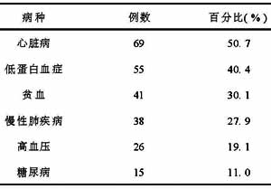1.4 术前合并症 本组136例中96例(70.6%)合并有1种或2种以上老年常见病,见表1。
