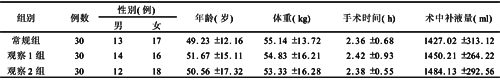 1.1 一般资料 选择手术时间>2h的全麻患者90例,用随机表法将其随机分为常规组、观察1组、观察2组各30例。年龄最大84岁,最小36岁。其中胃癌根治术34例,子宫颈癌根治术23例,乳腺癌根治术16例,直肠癌根治术11例,结肠癌根治术6例。三组患者一般资料比较详见表1。