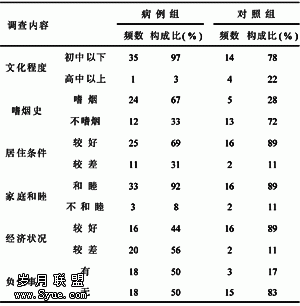 由表1可见,宿主因素文化程度项中病例组高中以上文化程度构成比低于对照组(3%、22%),个人行为嗜烟项中病例组构成比明显高于对照组(67%、28%),病例组中嗜酒者构成比亦高于对照组(47%、17%);环境因素中居住条件项对照组居住条件较好者构成比略高于病例组(89%、69%),家庭和睦项中,病例组与对照组大多为和睦家庭(92%、89%)构成比相当,经济状况项中病例组经济状况较差者构成比明显高于对照组(56%、11%),负性事件项中病例组有过家庭负性事件发生的构成比亦明显高于对照组(50%、17%)。