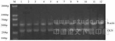 1.3 引物 根据GenBank核酸数据库CK20(X73502):使用Primer Premier 5.0设计两对引物:CK20:目的基因扩增片段长280bp;sense:5’-GAACAGGCTCAGGACTATCT-3’;anti-sense:5’-CCACTGTAATATGCGGTAAG-3’;β-actin:目的基因扩增片段长510bp;sense:5’- CCCTGGACTTCGAGCAAGAGAT-3’ ;anti-sense: 5’-GATTTTCTGCGCAAGTTAGG-3’;以上引物均由大连Takara公司合成。