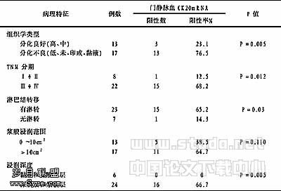 表1 门静脉血CK20mRNA 检出率与胃癌病理特征之间的关系
