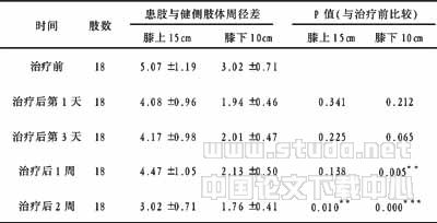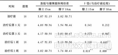 18例患者患肢与健侧肢体周径差自治疗后第1天起比治疗前明显缩小,并呈持续性下降。治疗后1周,膝下10cm肢体周径差与溶栓前比较差异有非常显著性(P=0.005)。治疗后2周,膝上15cm、膝下10cm肢体周径差与溶栓前比较差异均有非常显著性(膝上15cm P=0.01,膝下10cm P<0.001)。