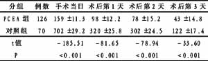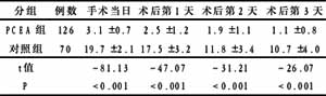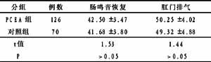PCEA组与对照组术后胃肠功能恢复时间差异无显著性,见表3。