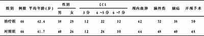 1.1 一般资料 治疗组66例患者均为伤后24h以内的重型颅脑损伤(GCS≤8分),伴颅内高压。同时选择66例为对照组。所有患者均经CT确诊,并排除其他脏器损伤引起的严重休克、缺氧或窒息;排除孕妇、14岁以下儿童及70岁以上老年人。两组患者主要临床资料无统计学差异,具可比性,见表1。