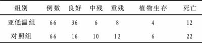 1.2 治疗方法 治疗组:患者急诊入院或手术后立即采用密切贴敷式冰帽及冰块,对头颈部及全身进行有效降温,一般使用0.5~1h后肛温即可降到35℃以下。根据肛温及制冷物的冷却时限,3~4h左右交替更换制冷物,以维持肛温在33℃~35℃。物理降温同时给予:冬眠合剂(氯丙嗪100mg+异丙嗪100mg+卡肌宁200~400mg+生理盐水500ml),用微量泵静脉维持;或氯丙嗪50mg+异丙嗪50mg+度冷丁50mg,肌注。根据患者的体温、心率、血压和肌张力调整用量,保证患者安静、无寒战和血压不低于70mmHg为度。通常降温3~5天,当患者颅内压正常时停亚低温药,撤去降温物复温。对照组:除不采用亚低温措施外,其余治疗及抢救措施与亚低温组相同。